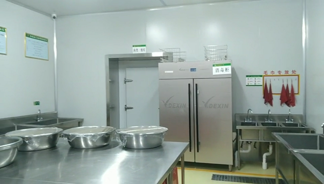 設備:單星水池、雙層工作臺、洗菜機用工作臺、新興榮福葉類蔬菜清洗線、新興榮福根莖類蔬菜清洗線、多功能切菜機、大型切菜機、高壓沖地龍頭、雙門消毒柜、蔬菜類二級庫等。